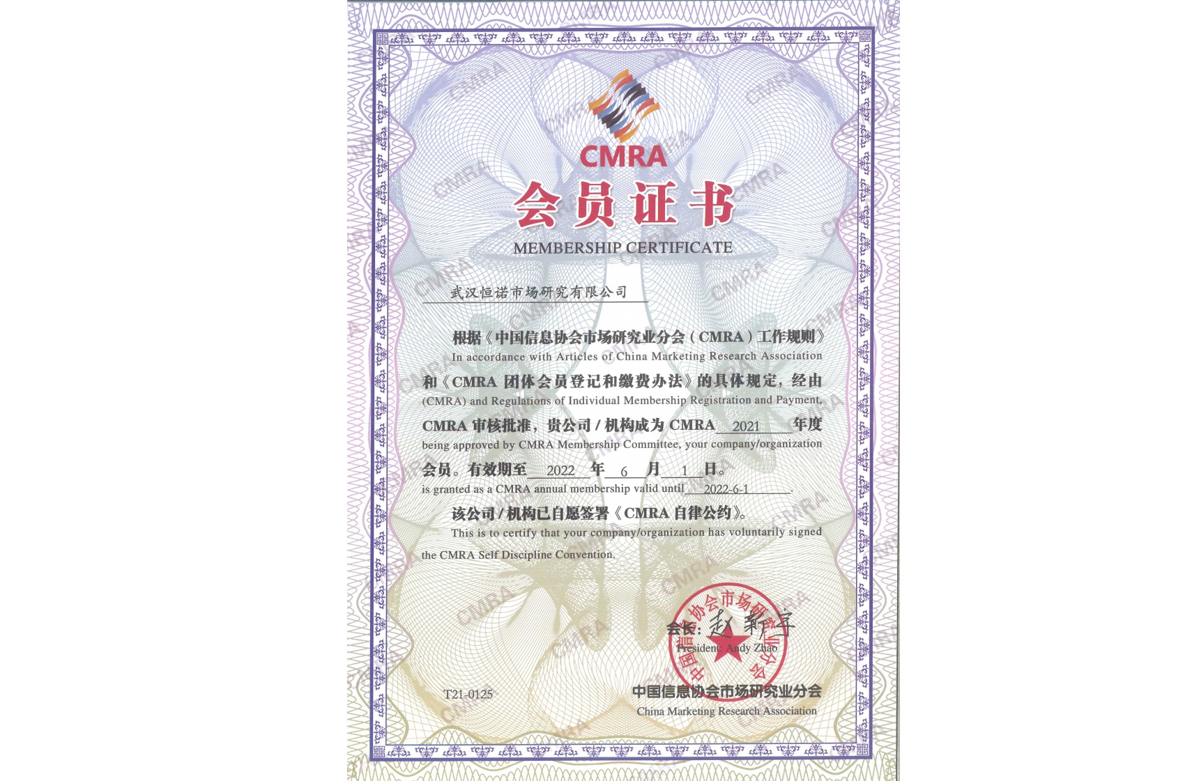CMRA協會會員證書